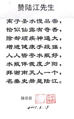 新疆63歲的賀兆生飲用一年,冠心病未愈,他用電話介紹是食堂管理員,問他食量多少?說吃七八分飽,睡前還吃兩袋牛奶,陸 江說我在論文和書中多次批判“吃七八分飽”,關照患者務必用“己饑方食”控制主食肉食量,要他把牛奶改在早中餐吃,減少主食肉食量,建議不吃晩餐,晚上只吃一個蘋果,再經幾個月補水節(jié)食,治愈了21年的冠心病和肥胖、失眠等病,信中由衷地感激陸 江為再生父母。[13]因為醫(yī)生從未過問他的膳食習慣,只管開處方藥或手術,父母也不會叫他不吃晩飯。