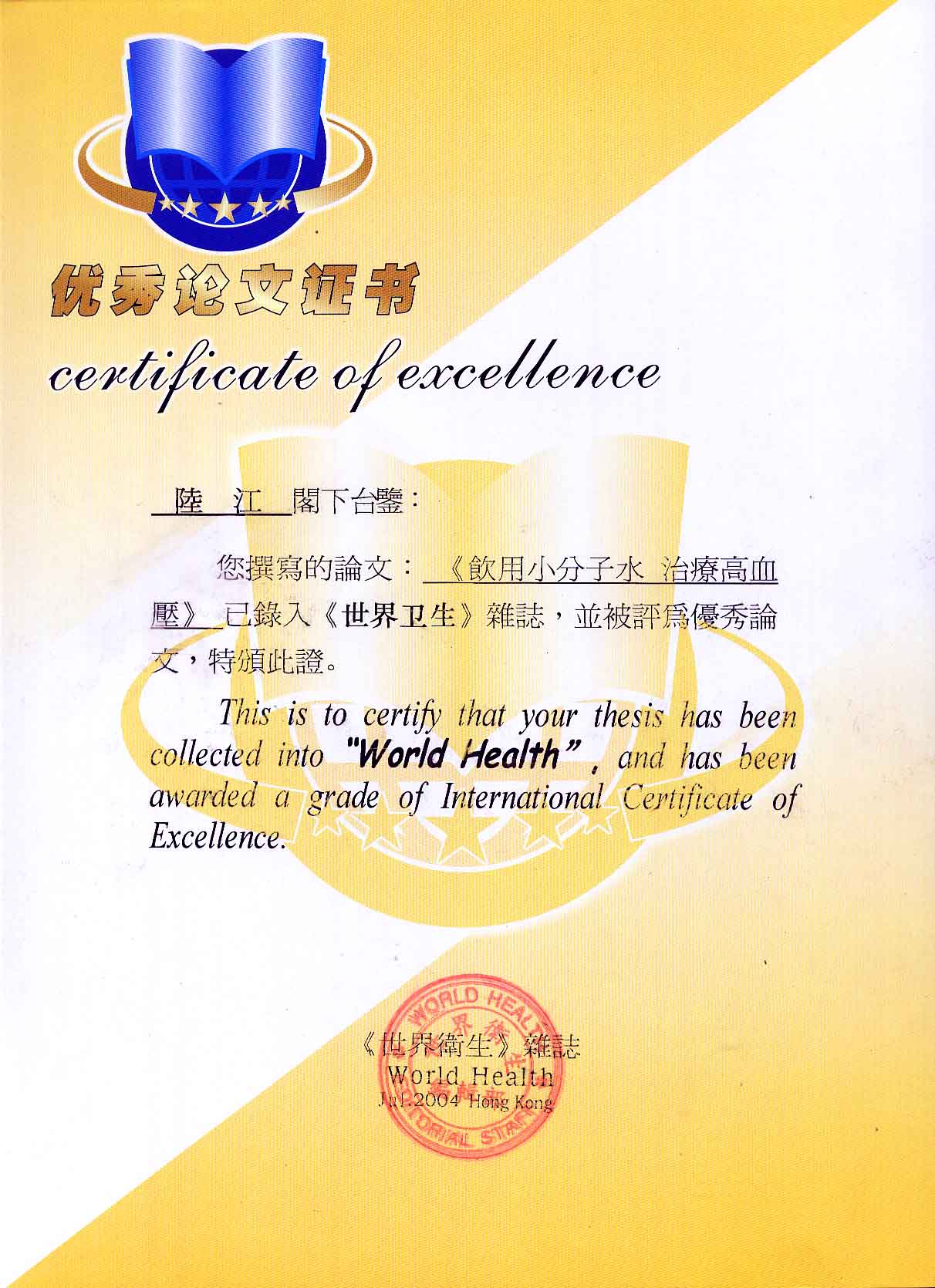 一、創(chuàng)造了在家在職場使用方便的微小分子團水器具。在世界上首先用此理療方法,大規(guī)模地成功地逆轉和消除動脈粥樣硬化,確實祛俆高血壓和冠心病與糖尿病,使患者恢復動脈和心臟及胰島的健康,可消除因細胞缺水使器官衰弱而形成多種器官的缺水性病癥,并使健康人可預防和減緩動脈粥樣硬化,減少心腦血管病,具有重大的社會經濟和戰(zhàn)略意義。