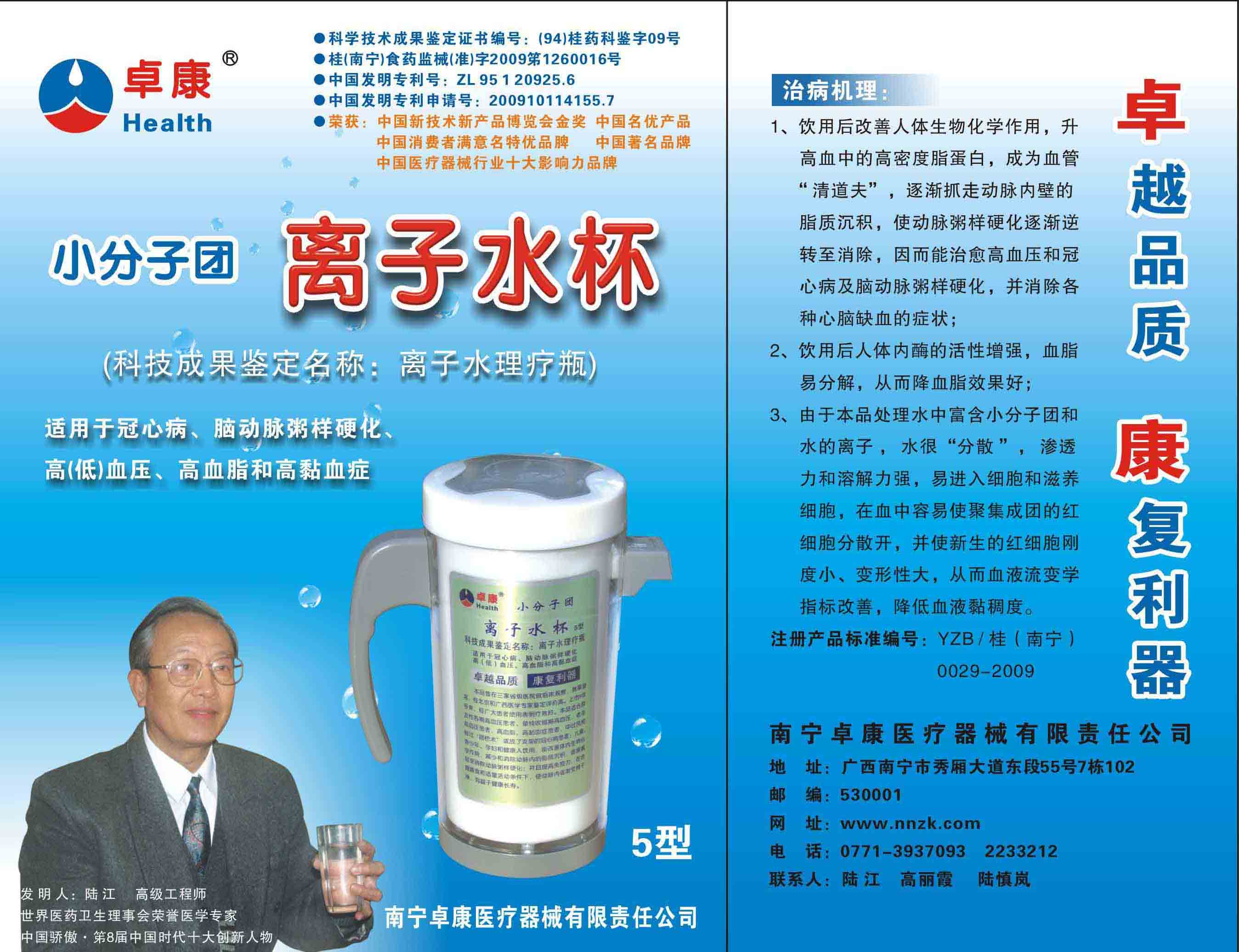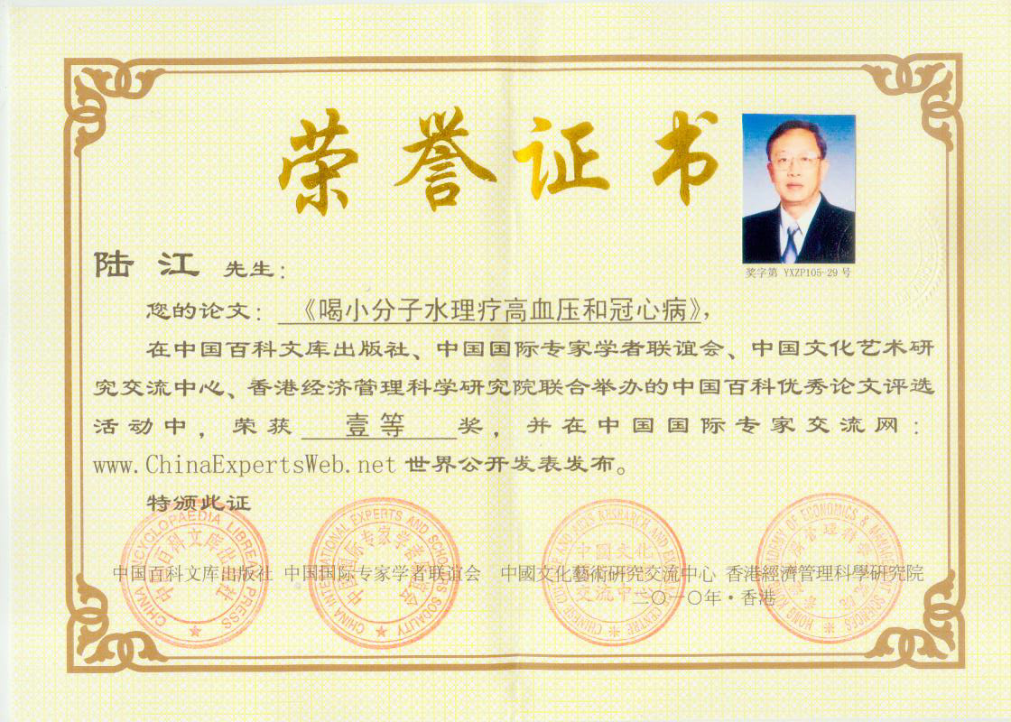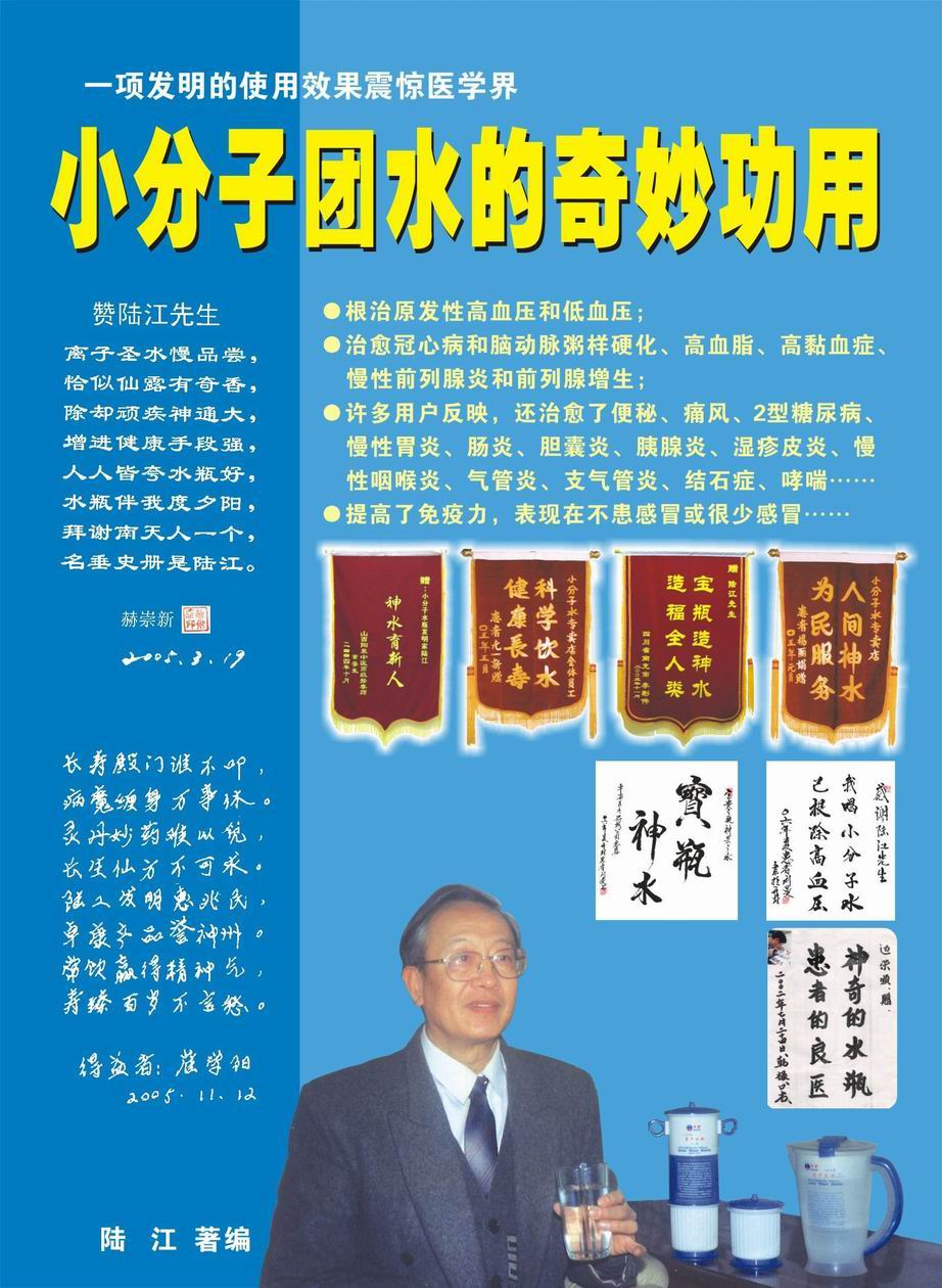 -----我是從事建筑的高工,本來沒有資格去攻克醫(yī)學難題,卻為了自身健康才扣響醫(yī)學的大門。由于我1990年患高血壓,因怕中風才研究發(fā)明了離子水瓶,我把水處理成微小分子團水,飲用后治愈了高血壓。便于1993年底送到三家省級醫(yī)院做臨床試用4個月。經北京和廣西醫(yī)學專家鑒定:"降脂降壓效果好"," 能擴大心腦動脈流量,改善心腦電圖以及微循環(huán)","對治療心腦動脈粥樣硬化、高血壓、高血脂有良好的醫(yī)療保健作用。""產品的技術性能和療效達到了同類產品的國內領先水平,經廣西醫(yī)學科學情報研究所檢索,未見國外有類似報道。"中國醫(yī)學科學院張正國教授從美國國立醫(yī)學圖書館數據庫存Medline檢索英俄文資料,均未見類似報告。2000年上市后,我為了對消費者負責而繼續(xù)觀察研究,一直通過《信譽卡》和《質量跟蹤調查書》向患者承諾療效,請用戶使用6個月后反饋效果。和脂壓患者飲用2至5個月內,消除癥狀,停服藥物,血壓正常;冠心病患者飲用3~5個月逐漸減輕至消除心絞痛、房顫等癥狀,不再服藥,飲用1年左右心電圖正常,經冠脈造影掃描無明顯狹窄,表明冠心病痊愈。大量患者還反映許多衰弱器官被修復,讓前列腺增生、慢性咽喉炎、慢性氣管炎、支氣管炎、慢性胃炎、腸炎和膽囊炎等不藥而愈;2型糖尿病患者是因為胰島衰弱致病,飲用該水半年至一年,逐漸減藥至停藥,血糖尿糖正常,真正治愈2型糖尿病。中風后遺癥患者飲用六七個月,可逐漸減輕至消除肢體和語言障礙,表明飲用該水能讓壽命很長的神經元細胞逐漸修復,奇跡般地恢復肢體和語言功能。飲用后還使胸腺和脾臟兩個重要的免疫器官被修復和增強,產生免疫細胞多,提高了免疫力,使人不生病或少生病。自此, 飲用微小分子團水創(chuàng)造了攻克冠心病、高(低)血壓和糖尿病三大醫(yī)學難題的奇跡。人們對此感到不可思議,但實踐是檢驗真理的唯一標準。
