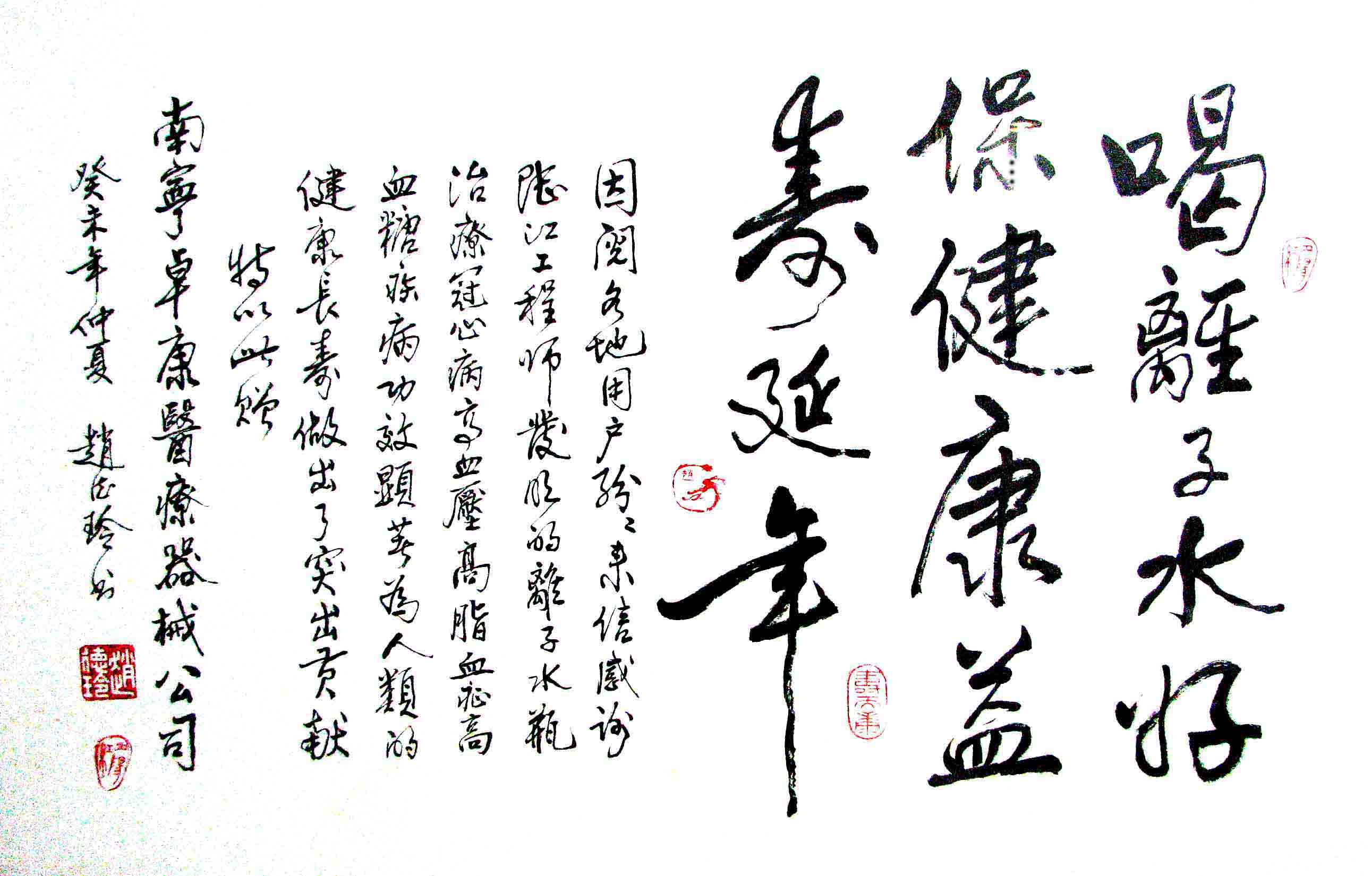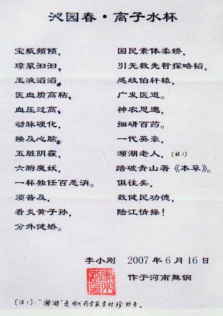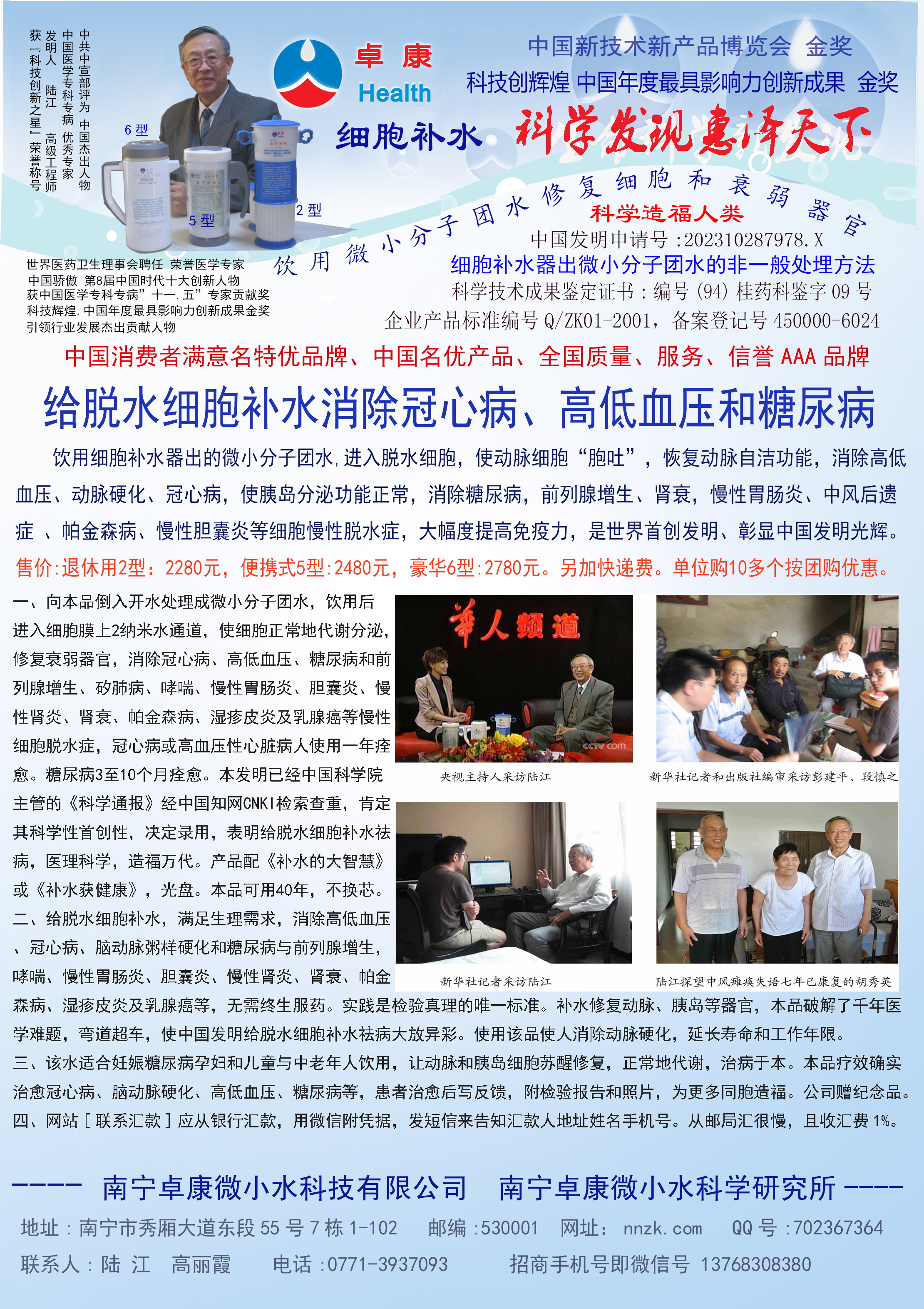 -----我是從事建筑的高工,本來沒有資格去攻克醫(yī)學難題,卻為了自身健康才扣響醫(yī)學的大門。由于我1990年患高血壓,因怕中風才研究發(fā)明了離子水瓶,我把水處理成微小分子團水,飲用后治愈了高血壓。便于1993年底送到三家省級醫(yī)院做臨床試用4個月。經北京和廣西醫(yī)學專家鑒定:"降脂降壓效果好"," 能擴大心腦動脈流量,改善心腦電圖以及微循環(huán)","對治療心腦動脈粥樣硬化、高血壓、高血脂有良好的醫(yī)療保健作用。""產品的技術性能和療效達到了同類產品的國內領先水平,經廣西醫(yī)學科學情報研究所檢索,未見國外有類似報道。"中國醫(yī)學科學院張正國教授從美國國立醫(yī)學圖書館數據庫存Medline檢索英俄文資料,均未見類似報告。2000年上市后,我為了對消費者負責而繼續(xù)觀察研究,一直通過《信譽卡》和《質量跟蹤調查書》向患者承諾療效,請用戶使用6個月后反饋效果。和脂壓患者飲用2至5個月內,消除癥狀,停服藥物,血壓正常;冠心病患者飲用3~5個月逐漸減輕至消除心絞痛、房顫等癥狀,不再服藥,飲用1年左右心電圖正常,經冠脈造影掃描無明顯狹窄,表明冠心病痊愈。大量患者還反映許多衰弱器官被修復,讓前列腺增生、慢性咽喉炎、慢性氣管炎、支氣管炎、慢性胃炎、腸炎和膽囊炎等不藥而愈;2型糖尿病患者是因為胰島衰弱致病,飲用該水半年至一年,逐漸減藥至停藥,血糖尿糖正常,真正治愈2型糖尿病。中風后遺癥患者飲用六七個月,可逐漸減輕至消除肢體和語言障礙,表明飲用該水能讓壽命很長的神經元細胞逐漸修復,奇跡般地恢復肢體和語言功能。飲用后還使胸腺和脾臟兩個重要的免疫器官被修復和增強,產生免疫細胞多,提高了免疫力,使人不生病或少生病。自此, 飲用微小分子團水創(chuàng)造了攻克冠心病、高(低)血壓和糖尿病三大醫(yī)學難題的奇跡。人們對此感到不可思議,但實踐是檢驗真理的唯一標準。
