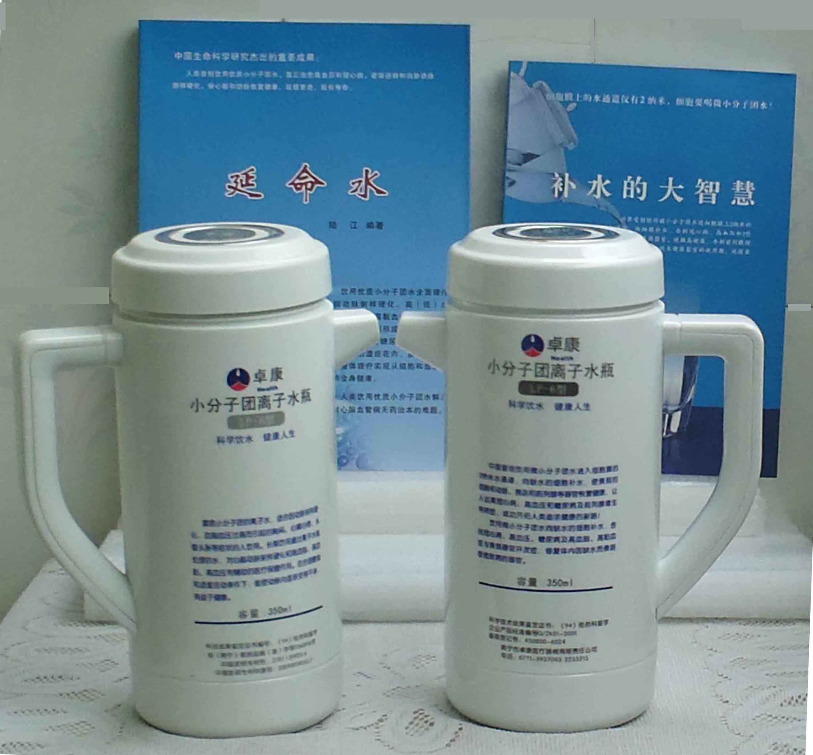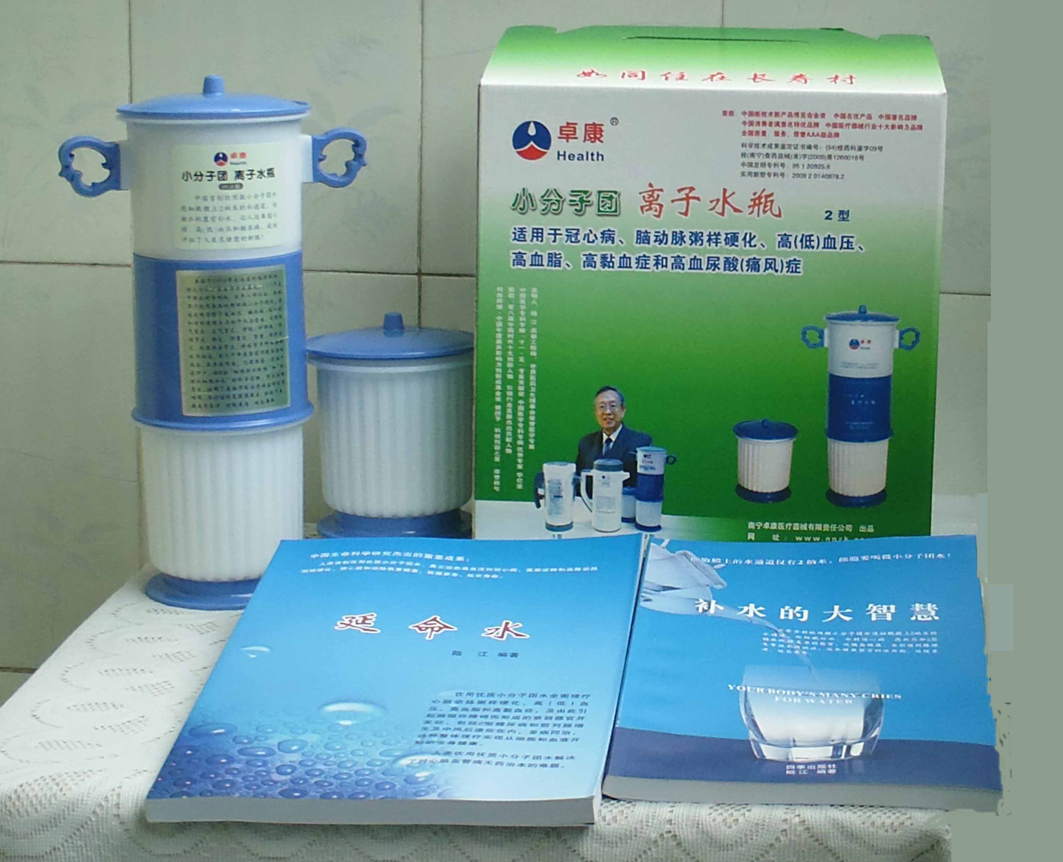 本品大量用戶的使用效果表明,能治愈冠心病、腦動脈硬化、原發(fā)性高(低)血壓、高血脂、高粘血癥、高血尿酸癥(痛風)和2型糖尿病、衰弱器官并發(fā)癥(前列腺增生、腎衰與尿毒癥)及中風后遺癥等療效好。產品配信譽卡。使用壽命30年,不換芯,易清洗。團購優(yōu)惠。從郵局匯款,匯費1%,地址按本頁下方地址、聯系人寫。從銀行匯款,請點擊[聯系匯款]欄,從工商銀行匯款,建設銀行、農業銀行匯款,均免收匯費,匯款后20--30分鐘內發(fā)短信,可用微信轉帳,均免匯費,微信號即手機號13768308380。匯款后,告知你的姓名和地址,我公司聯系人手機號是:13768308380。卓康牌離子水瓶為我公司獨家生產,郵購產品配《補水的大智慧》彩印書一本,另配四季出版社出版的新書《補水的大智慧》一本,并配光盤一張(含央視主持人釆訪陸江的對話視頻)。目前市場和"淘寶網"上有人兜售假冒的偽品,望讀者審察辯別真偽,造假者剽竊假冒本公司的各種認證、獲獎獎項、專利號和外包裝盒上的中英文字,包括科技成果的鑒定意見等,請讀者注意防偽。如何識別假貨?已經買了假貨怎么辦?(請點擊[打假掠影][打假掠影])。