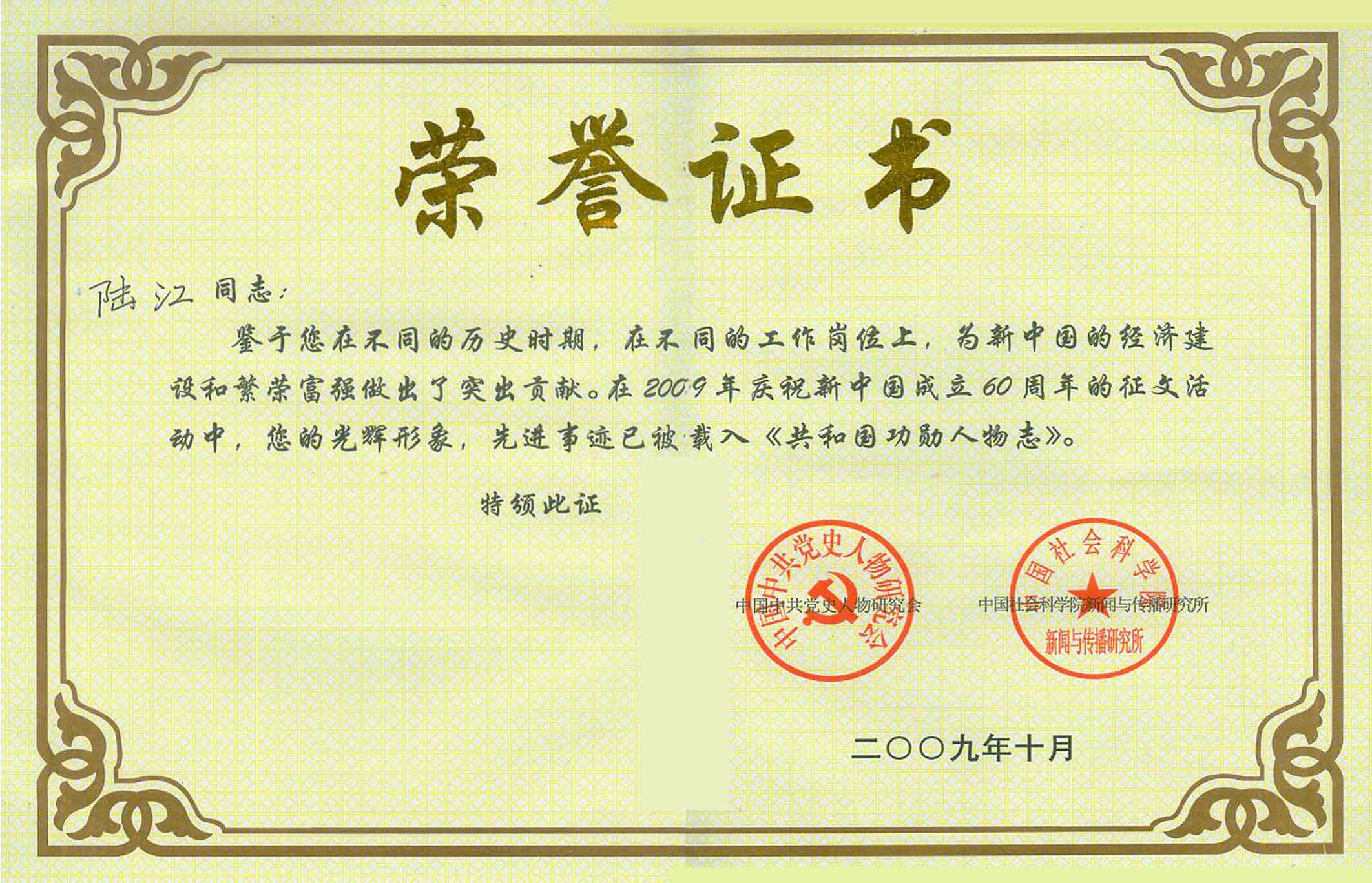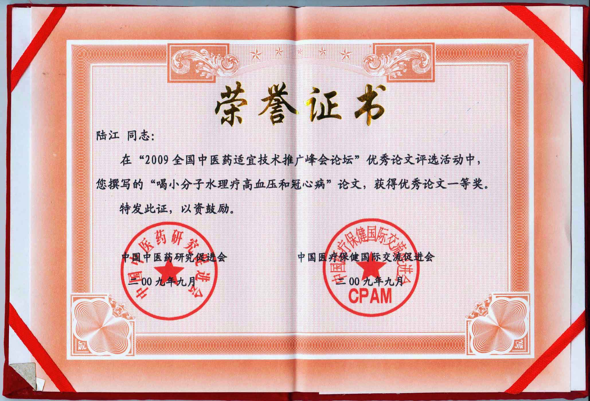 陸江的論文獲一等獎榮譽證書-- 陸江論文獲創(chuàng)新論文獎牌